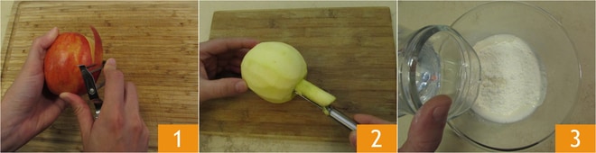 Pour préparer le dessert avec des annurca et du sabayon, épluchez les pommes 1 et avec un couteau, retirez le trognon en laissant un trou au centre 2. Dans un bol, mélangez les biscuits émiettés avec les flocons d'avoine. Dans un autre bol, mélangez la farine et l'eau, petit à petit 3.