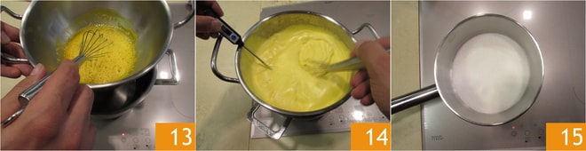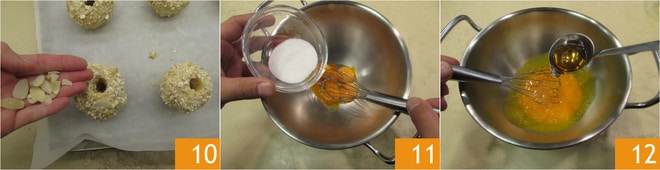 Décorez la surface avec des éclats d'amandes 10. Cuisez au four statique à 180° pendant 45-50 minutes, en vérifiant de temps en temps, car la cuisson dépend de la jutosité des pommes. Pendant ce temps, préparez le sabayon en mettant dans un bol les œufs et le sucre 11, mélangez pour amalgamer. Ajoutez petit à petit le marsala 12.