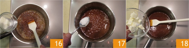 Quand le caramel aura une couleur ambrée, ajoutez le lait et mélangez. Éteignez et continuez à mélanger pour épaissir, ajoutez le sel 17 et le beurre 18.