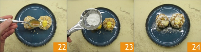 Décorez avec le caramel salé 22 et une pincée de sucre glace 23. Le dessert avec annurca et sabayon est prêt à être dégusté 24.