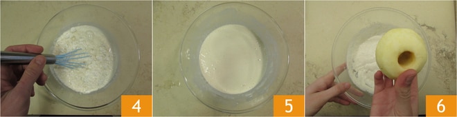 Mélangez bien avec le fouet 4 pour créer une pâte lisse et sans grumeaux 5. Trempez les pommes d'abord dans la pâte de farine et d'eau 6.