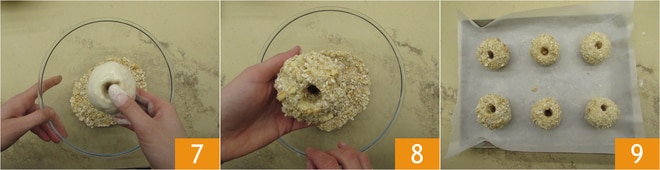 Recouvrez les pommes avec les miettes de biscuits et d'avoine 78. Disposez les pommes sur une plaque recouverte de papier sulfurisé 9.
