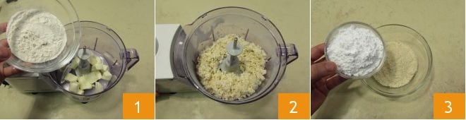 Pour préparer les diamants au cacao et aux amandes, commencez par verser le beurre froid en morceaux et 230 g de farine type 00 dans un mixeur 1. Actionnez les lames jusqu'à obtenir une pâte sableuse 2 et mettez-la de côté dans un grand bol. Prenez un autre petit bol pour mélanger le sucre glace et la farine d'amandes 3,