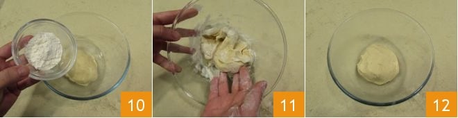 Dans l'autre, ajoutez les 20 g de farine 00 restante 10 et incorporez-la à la pâte en vous aidant des mains 11 jusqu'à obtenir une pâte lisse et homogène 12.