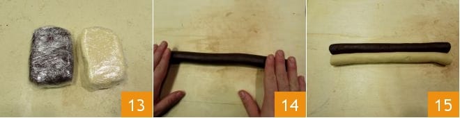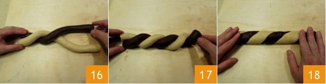 Prenez maintenant un cylindre au cacao et un uniquement à la farine, et disposez-les côte à côte : enroulez-les en superposant un boudin sur l'autre 16 jusqu'à arriver à la fin des boudins 17 : roulez le boudin bicolore obtenu en le pressant et en l'étirant légèrement avec la pression des mains jusqu'à obtenir un nouveau boudin d'environ 3 cm de diamètre 18. Répétez l'opération avec les deux autres boudins.