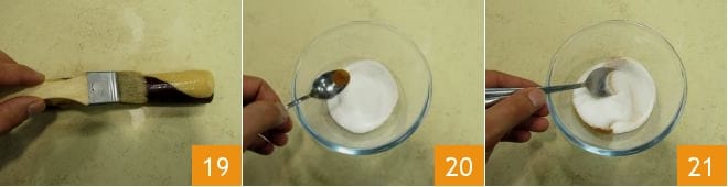Badigeonnez les boudins obtenus avec un peu d'eau à température ambiante 19. Puis, dans un petit bol, mélangez la cannelle avec le sucre 20 et mélangez les ingrédients 21.