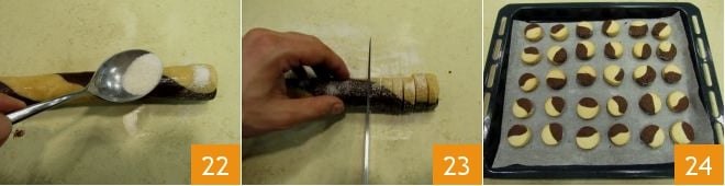 Saupoudrez les boudins avec le mélange de sucre et cannelle obtenu 22 et coupez les cylindres en disques de 7 mm d'épaisseur 23 que vous disposerez sur une plaque de cuisson recouverte de papier sulfurisé. Enfournez dans un four statique préchauffé à 160°C pendant 20 minutes (pour ces biscuits, nous déconseillons l'utilisation du four à chaleur tournante ou, à la rigueur, nous conseillons de tester la cuisson de quelques pièces comme première fournée pour vérifier les temps et la température pour les suivantes). Une fois cuits, retirez vos diamants au cacao et aux amandes du four 24, laissez tiédir et dégustez !