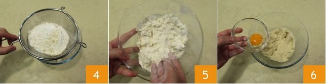 puis tamisez-les ensemble dans le bol où vous avez mis le mélange sableux de beurre et farine 4, en mélangeant rapidement les ingrédients avec les mains 5. Ensuite, ajoutez l'œuf 6 et continuez à pétrir rapidement avec les mains pour obtenir un mélange homogène et lisse.