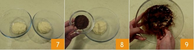 Divisez la pâte obtenue en deux petits bols différents 7 : dans l'un, ajoutez le cacao 8 et commencez à pétrir avec les mains 9 jusqu'à obtenir une pâte homogène.