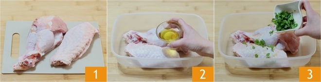 Pour préparer la dinde au four avec des pommes de terre, coupez le pilon de dinde en deux ou trois parties 1. Lavez bien la viande et séchez-la avec un torchon. Déposez la viande dans un récipient pas trop grand et assaisonnez-la avec de l'huile 2, le persil haché 3