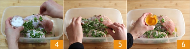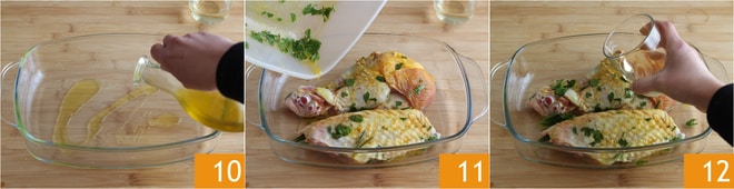 Huilez un plat à four 10, une fois le temps de marinade écoulé, disposez la dinde dans le plat avec la marinade 11. Assaisonnez avec le vin 12.