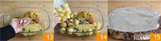 l'ail pelé 13 et l'huile. Ajoutez également les pommes de terre 14, couvrez avec une feuille de papier aluminium et cuisez à 200° dans un four ventilé pendant 30 minutes.