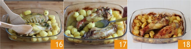 Après 30 minutes, retirez du four, enlevez le papier aluminium et retournez les morceaux de dinde. Continuez la cuisson au four, sans papier aluminium pendant 50-60 minutes. Retournez souvent les ingrédients pour bien les faire dorer, et arrosez-les avec le jus de cuisson 17. Les 10 dernières minutes, ajoutez sur la viande des noisettes de beurre pour créer une croûte en surface. La dinde au four est prête à être servie 18.