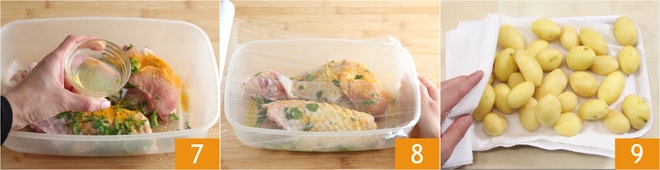 et le jus de citron 7. Mélangez le tout avec les mains pour bien enrober la viande avec les arômes. Couvrez avec du film plastique 8 et laissez mariner pendant 1 heure. Pendant ce temps, lavez et épluchez les pommes de terre nouvelles 9 et coupez-les en deux ou, si vous préférez, laissez-les entières.
