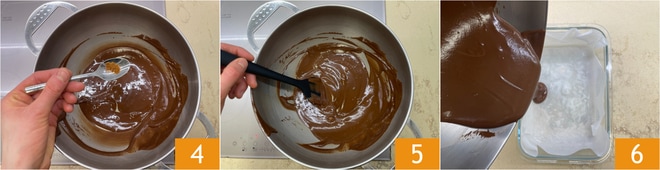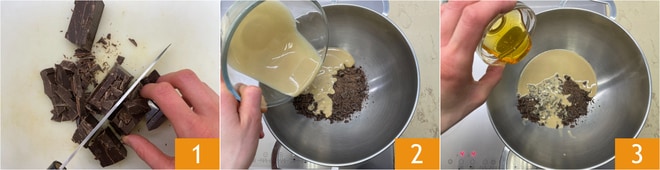 Pour préparer les friandises au chocolat et tahini, commencez par hacher le chocolat noir 1 et faites-le fondre au bain-marie avec le tahini 2 et le miel 3. Mélangez jusqu'à ce que tout le chocolat soit fondu et que vous obteniez un mélange homogène.
