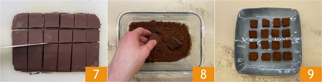 Une fois le temps de raffermissement écoulé, coupez le bloc en cubes réguliers 7, puis passez-les dans le cacao amer 8. Vos friandises au chocolat et tahini sont prêtes à être servies 9 !