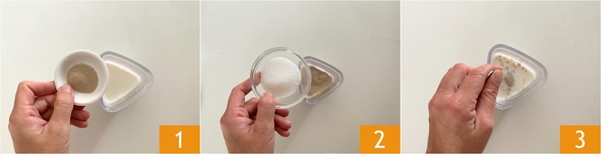 Pour préparer les beignets frits, commencez par la pâte. Versez le lait à température ambiante dans un petit bol, ajoutez la levure 1 et le sucre 2. Mélangez jusqu'à ce qu'ils soient bien dissous 3.