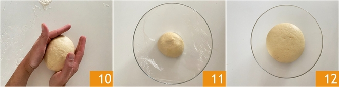 Vous devez obtenir une pâte lisse et élastique 10. Huilez légèrement un bol et placez y votre pâte, puis couvrez de film plastique 11 et laissez lever, à température ambiante, jusqu'à ce qu'elle double de volume 12. Cela prendra environ 4-5 heures.