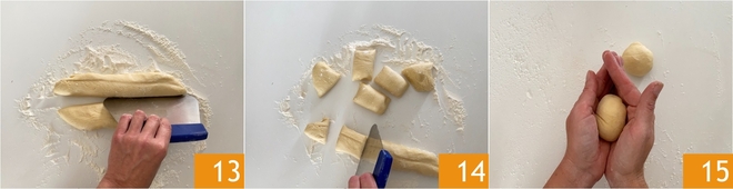 Une fois ce temps écoulé, transférez à nouveau la pâte sur un plan de travail et formez deux rouleaux 13. De chaque rouleau, découpez 5 morceaux égaux 14, pour en obtenir 10. Prenez chaque portion et en la travaillant entre les mains, formez une petite boule 15.