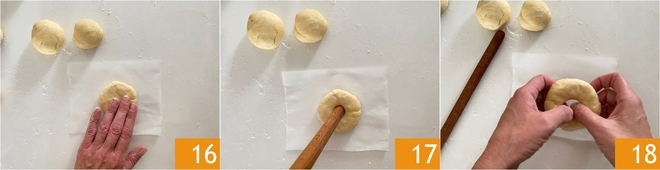 Découpez 10 carrés de papier sulfurisé. Huilez-vous les mains légèrement et aplatissez chaque boule sur un des carrés de papier sulfurisé 16, vous devez obtenir un disque d'environ 8-10 cm. Utilisez le bas d'une cuillère en bois pour faire un trou au centre 17 et élargissez-le délicatement avec les mains 18.