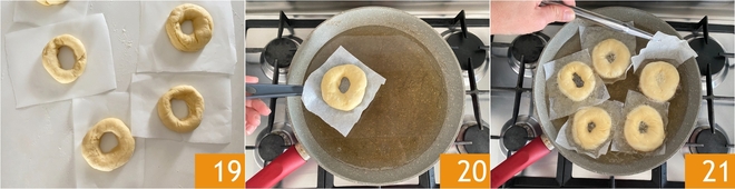 Procédez ainsi avec toute la pâte. Laissez lever les beignets une heure de plus sans les couvrir 19. Versez 3 doigts d'huile dans une poêle à bords hauts et portez-la à une température de 170°C. À ce moment, mettez les beignets dans l'huile (peu à la fois pour ne pas faire baisser la température) avec le papier sulfurisé 20, qui se détachera après moins d'une minute. Retirez peu à peu les feuilles de papier sulfurisé à l'aide d'une pince 21.