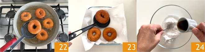 Faites dorer les beignets des deux côtés 22. Cela prendra 5-6 minutes au total. S'ils dorent trop vite, baissez le feu. Placez les beignets au fur et à mesure sur du papier absorbant 23. Préparez le glaçage. Placez le sucre glace dans un bol et ajoutez le café petit à petit (pas tout d'un coup car cela pourrait ne pas être nécessaire), en mélangeant progressivement avec une fourchette 24.