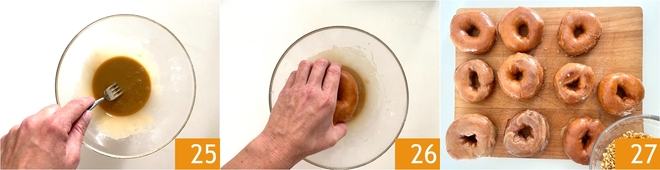Vous devez obtenir un glaçage dense et sans grumeaux 24. Trempez le dessus des beignets dans le glaçage 26, retournez-les sur une planche à découper et saupoudrez-les immédiatement de noisettes concassées 27. En quelques minutes, le glaçage sèchera et vous serez prêt à déguster vos beignets!