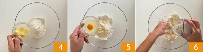Dans un grand bol, versez la farine et le beurre 4, ajoutez l'œuf 5 et commencez à pétrir avec les mains. En continuant à pétrir, versez lentement le lait dans lequel vous avez dissous la levure 6.