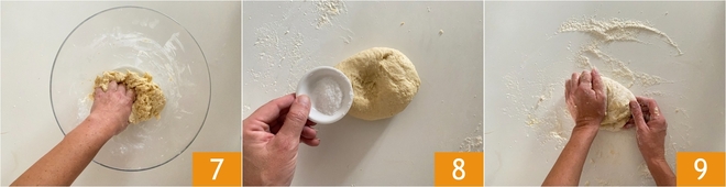 Continuez à travailler jusqu'à obtenir un mélange homogène 7, puis transférez-vous sur un plan de travail fariné, ajoutez une pincée de sel 9 et travaillez la pâte pendant environ 10 minutes 8.