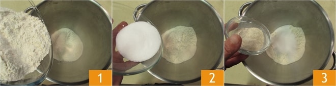 Pour réaliser les donuts, commencez par chauffer légèrement le lait qui vous servira à préparer la pâte. Pendant ce temps, versez dans le bol d'un robot pâtissier équipé d'un crochet la farine 00 et la farine manitoba 1. Ajoutez le sucre 2 à la levure de bière avec levain déshydraté 3.