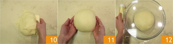 Détachez la pâte du crochet avec les mains légèrement humides, puis aidez-vous d'une corne pour la retourner sur le plan de travail 10. Saupoudrez de peu de farine et façonnez la pâte en boule, toujours en vous aidant d'une corne pour la manipuler plus facilement 11. Transférez-la dans un grand bol, préalablement beurré, couvrez de film plastique et laissez reposer pendant 2 heures dans le four éteint avec la lumière allumée 12.