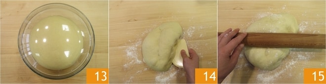 Après le temps de levée, la pâte aura doublé de volume. Transférez-la à nouveau sur le plan de travail légèrement fariné 14 et étalez-la au rouleau à pâtisserie 15.