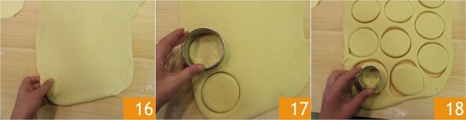 Vous devez obtenir une épaisseur de 1 cm 16. En utilisant un emporte-pièce de 8 cm de diamètre, découpez des cercles de pâte 17, bien les rapprocher. À ce stade, en utilisant un emporte-pièce plus petit, de 4,5 cm, réalisez les trous des beignets 18.
