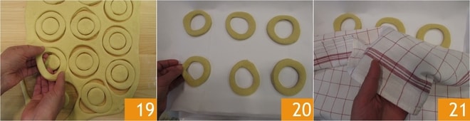 Soulevez délicatement les beignets 19 et placez-les sur des carrés de papier sulfurisé d'environ 10 cm de côté placés sur un plateau 20 ; transférez également sur un plateau tapissé de papier sulfurisé les chutes de pâte. Couvrez les plateaux avec un torchon 21 et laissez lever pendant 40 minutes à l'abri des courants d'air.
