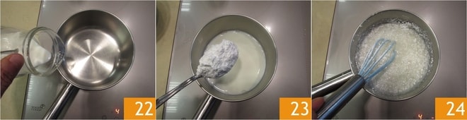Lorsque les beignets sont presque levés, vous pouvez vous consacrer au glaçage. Transférez le lait dans une casserole 22, chauffez-le et ajoutez le sucre glace 23. Remuez au fur et à mesure avec un fouet 24.