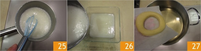 Faites cuire jusqu'à ce que le mélange épaississe 25, transférez-le dans un petit bol 26 et laissez refroidir. Passez à la friture. Chauffez l'huile de tournesol dans une grande casserole jusqu'à atteindre la température de 175 °C. Lorsque l'huile est chaude, soulevez le premier beignet, en vous aidant du papier sulfurisé et plongez-le dans l'huile 27. En utilisant le papier sulfurisé, la forme ne changera pas.