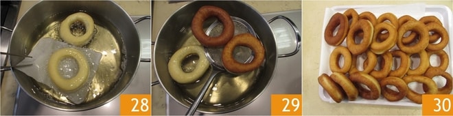 Après quelques secondes, vous pourrez retirer le papier sulfurisé en utilisant une pince de cuisine 28. Retournez-les des deux côtés avec une écumoire jusqu'à ce qu'ils soient uniformément dorés, cela prendra environ 3 minutes 29, puis égouttez-les sur du papier absorbant 30. Plongez également les chutes dans l'huile et faites-les frire pour obtenir les fameux trous de donuts.