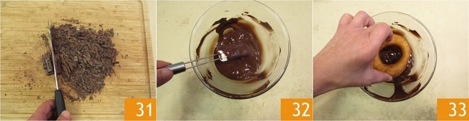 Alors que les beignets tiédissent, vous pouvez vous consacrer à faire fondre le chocolat. Coupez-le en morceaux 31 et faites-le fondre au micro-ondes, en l'activant quelques secondes à la fois, jusqu'à ce qu'il soit fondu 32. Alternativement, vous pouvez faire fondre le chocolat au bain-marie. Passez maintenant à la décoration. Plongez le premier donut dans le chocolat seulement à moitié 23.
