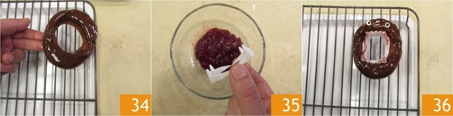 Soulevez-le et retournez-le sur une grille 34. Étalez de la confiture sur des dents en plastique 35 et placez-les à l'intérieur du trou du beignet. Décorez ensuite aussi avec les yeux 36.