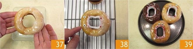 Faites maintenant la même chose pour décorer les donuts avec le glaçage au lait. Plongez-les dans le glaçage, retournez-les 37, transférez sur une grille et décorez comme précédemment 38. Continuez jusqu'à épuiser les ingrédients, laissez durcir et servez vos donuts vampires 39 !