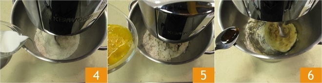 Actionnez le robot à vitesse modérée et versez le lait en filet 4. Ajoutez les œufs peu à peu pour ne pas alourdir la pâte 5 et parfumez avec l'extrait de vanille 6.