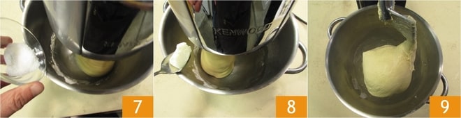 Enfin, ajoutez également le sel 7 et continuez à travailler jusqu'à ce que la pâte se détache des parois du bol et soit bien lisse. À ce stade, vous pouvez ajouter le beurre ramolli, un morceau à la fois 8, en veillant à ce que le précédent soit bien absorbé avant d'en ajouter un autre ; cela prendra environ 15-20 minutes. Vous devrez obtenir une pâte lisse et homogène 9.