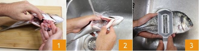 Pour préparer la dorade à la poêle, commencez par nettoyer le poisson (sinon si vous les achetez déjà éviscérées, leur poids devrait être d'environ 400 g chacune) : faites une incision sur le ventre avec des ciseaux et retirez les entrailles avec les mains 1, puis rincez soigneusement l'intérieur sous l'eau courante 2 et enlevez les écailles en utilisant un écailleur ou la lame d'un couteau ; faites cette opération sous l'eau courante ou à l'intérieur d'un sac en plastique, pour ne pas disperser les écailles partout 3. Pour plus de détails sur la procédure, consultez notre école de cuisine « Comment nettoyer la dorade ».