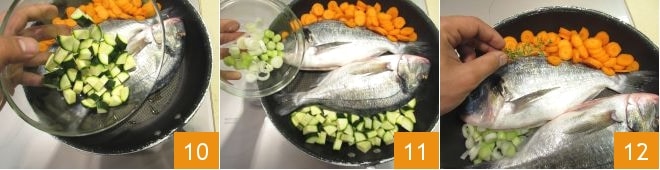 Couvrez la poêle avec un couvercle 13 et faites cuire à feu moyen pendant 7 minutes, puis retournez les dorades à l'aide de 2 spatules en faisant attention à ne pas les casser 14 ; couvrez à nouveau avec le couvercle et faites cuire pendant 7 minutes supplémentaires 15. Les temps de cuisson, bien sûr, peuvent varier selon le poids de la dorade que vous utilisez. La dorade à la poêle est prête à être servie !