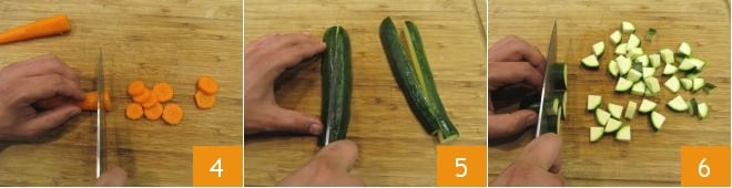 Passez maintenant à la découpe des légumes : lavez et épluchez les carottes, puis coupez les extrémités et tranchez-les en rondelles d'environ 5 mm d'épaisseur 4. Lavez et épluchez aussi les courgettes, coupez-les en deux dans le sens de la longueur et divisez chaque moitié 5 ; enfin, coupez-les en dés d'environ 1 cm d'épaisseur 6.