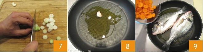 Pour finir, lavez le cébette, enlevez la base et coupez-le en rondelles d'environ 5 mm d'épaisseur 7. Versez l'huile dans une grande poêle antiadhésive, ajoutez la gousse d'ail en chemise et faites-la revenir pendant quelques minutes 8. Lorsque l'huile est parfumée, retirez l'ail de la poêle et déposez-y les dorades, puis ajoutez les carottes 9,