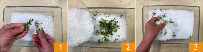 Pour préparer la dorade en croûte de sel, commencez par verser le premier kilo de sel dans un plat, ajoutez le thym citronné 1, puis ajoutez le reste du sel 2 et mélangez 3.
