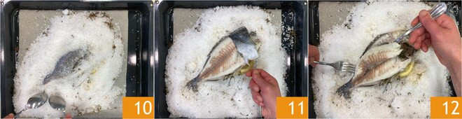 Une fois cuit, cassez la croûte de sel avec 2 cuillères 10, enlevez la peau avec précaution 11 et retirez les filets 12. En utilisant deux fourchettes, il sera facile de soulever les filets au-dessus de l'arête; puis en levant la tête, retirez l'arête et prélevez également les filets en dessous.