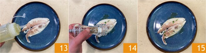 Servez, assaisonnez avec de l'huile 13, du thym et du poivre 14. La dorade en croûte de sel est prête à être dégustée 15.