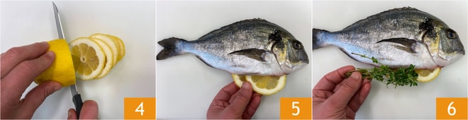 Pendant ce temps, coupez le citron en tranches 4 et remplissez le ventre de la dorade, préalablement nettoyée et éviscérée, avec les tranches de citron 5 et du thym citronné 6.